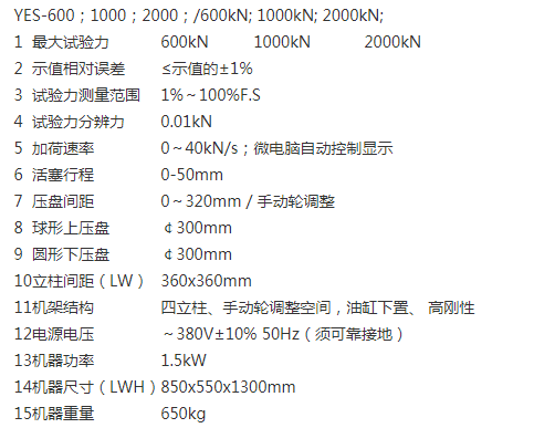 產(chǎn)品規(guī)格 YES-600;1000;2000;600kN;1000kN;;2000kN;YES系列經(jīng)濟型數(shù)顯式壓力試驗機