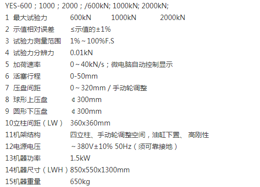 產品規(guī)格 YES-600;1000;2000;600kN;1000kN;;2000kN;YES系列經濟型數(shù)顯式壓力試驗機
