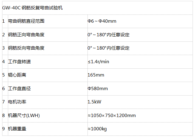 GW-40C鋼筋反復彎曲試驗機對鋼筋等金屬材料進行正向180°彎曲試驗、反向180°彎曲試驗,觀測試件是否產(chǎn)生裂紋,判斷鋼筋等金屬材料在彎曲塑性變形與時效后的反向彎曲變形性能。